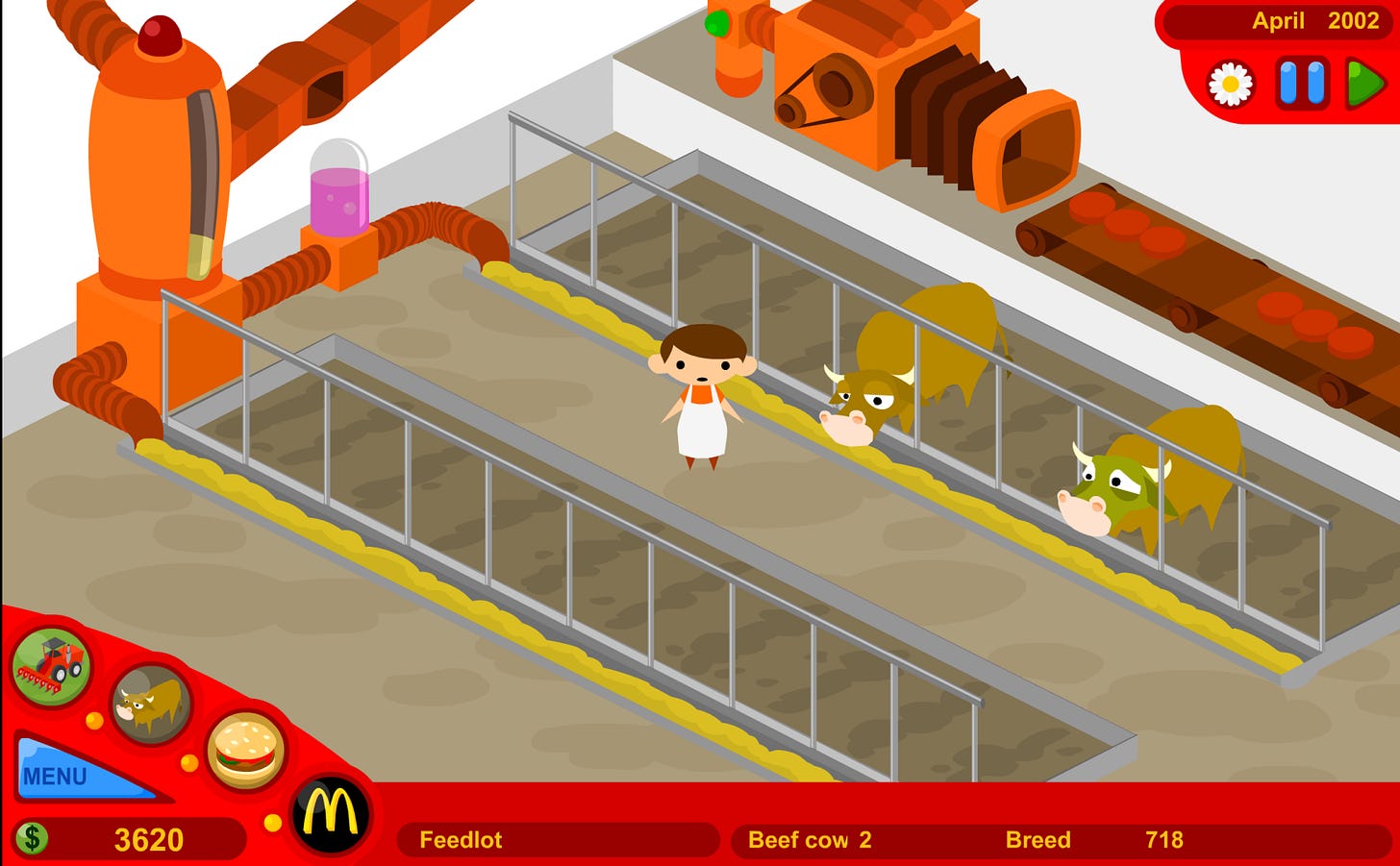 The game presents the player with four views: the farmland, the slaughterhouse, the restaurant and the corporate HQ. Through each of these views, decisions can be made which will affect the fate of the player’s company. In the game, the player takes on the role of a McDonald’s CEO by choosing whether or not to feed the player’s cows genetically altered grain, plow over rainforests or feed the player’s cattle to other cattle (a practice known to spread mad cow disease). The player can also choose advertising strategies and public official corruption to counteract opponents of the player’s actions.